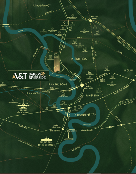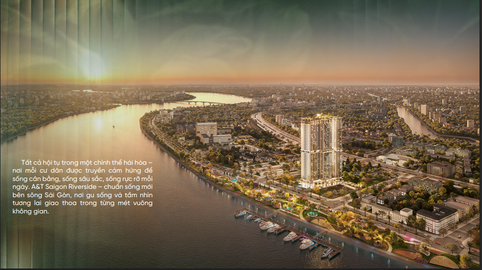 A&T Sài Gòn Riverside tọa lạc trên quỹ đất “vàng” hiếm hoi ngay trung tâm Thuận An – TP. Hồ Chí Minh Mới, nơi hội tụ đầy đủ yếu tố về vị trí, hạ tầng và tiềm năng phát triển vượt bậc. Dự án được quy hoạch bài bản với hệ thống hạ tầng hiện đại, mang đến một không gian sống sang trọng, bình yên và ngập tràn sắc xanh thiên nhiên. Điểm nhấn của A&T Sài Gòn Riverside là thiết kế kiến trúc hiện đại gồm hai tòa tháp vững chãi vươn cao giữa lòng đô thị năng động – biểu tượng cho phong cách sống hài hòa giữa thiên nhiên và nhịp sống thành thị.
